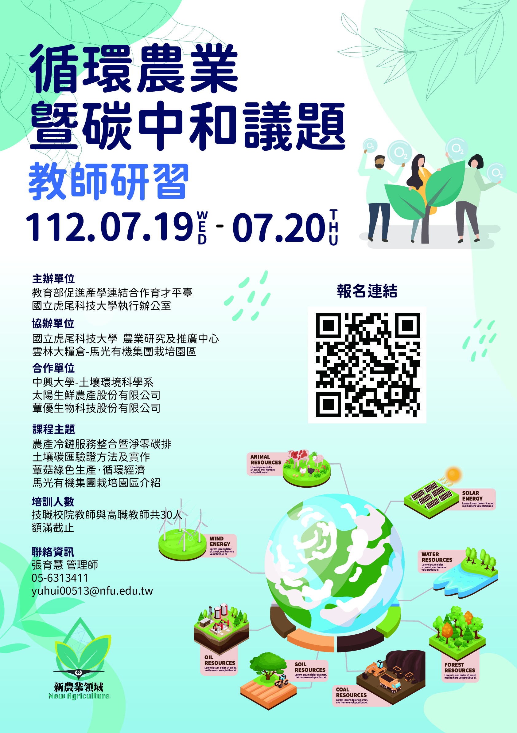 隨著全球暖化日益嚴重,對於農業及糧食安全影響甚鉅,隨著國際淨零減排議題熱潮,臺灣加入2050年達到淨零碳排目標的行列,農業部門宣示在2040年完成目標,擘劃推動相關調適策略,包括溫室氣體淨零減排、增匯與循環農業等;因應追求淨零碳排的目標趨勢下,農企業陸續啟動淨零轉型,促進農產業升級、達永續農業目標,相關知識及人才培育應盡早儲備,期透過教師研習課程的推動,讓教師可以更了解「淨零碳排」相關趨勢新知,並能將淨零議題帶入課程教學或發展主題課程。
